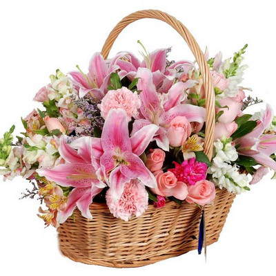 8支粉百合,19朵戴安娜粉玫瑰,7支粉康,粉桔梗,白色紫罗兰,情人草、绿叶等