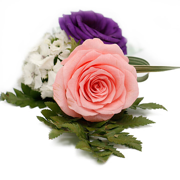 戴安娜粉玫瑰1朵,紫桔梗1朵,白色相思梅,高山羊齿,丝带草,金色金聪缎带