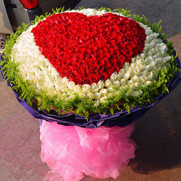 520朵玫瑰,用红玫瑰围成心形,其余用白玫瑰填充。黄莺丰满围边