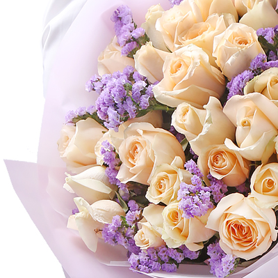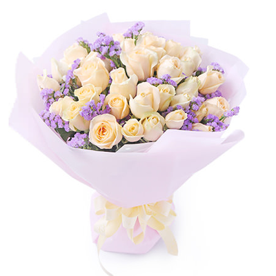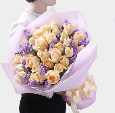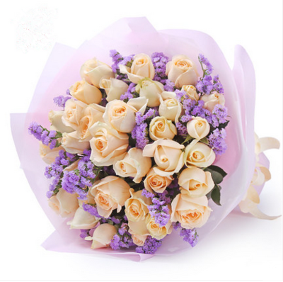 粉紫色精美双层包装纸包装,精美淡黄色蝴蝶结束扎花语:你是我的方向,爱到如飞蛾扑火般的信仰。附送:
