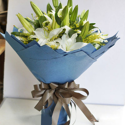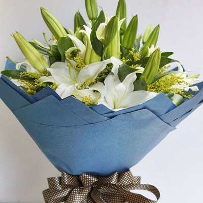 内衬白色皱纸外围蓝色皱纸折角包装,丝带蝴蝶结束扎。花语:春天又来临了,绿衣使者带给您的是:一代人对您的长长的思念,深深的祝福。附送: