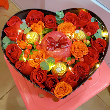15朵红玫瑰,搭配橙色泡泡,尤加利间插,1个平安果,3颗费列罗巧克力,1条灯带