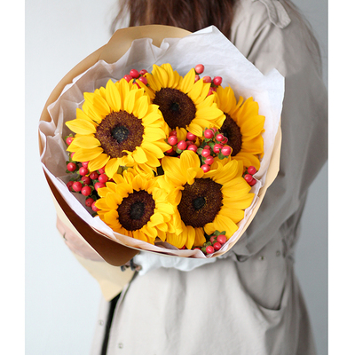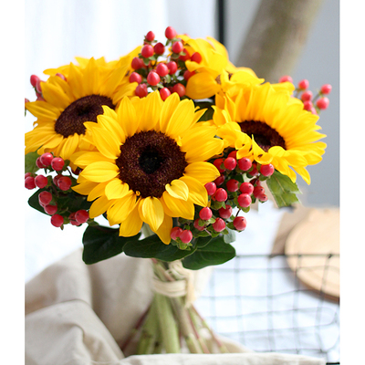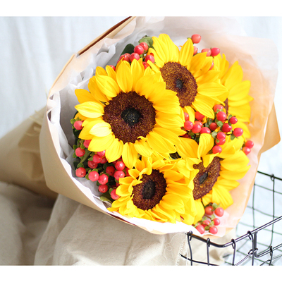 5朵向日葵,红豆搭配。