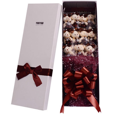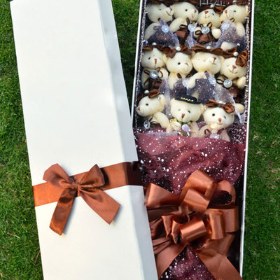高级礼盒装,咖啡色蝴蝶结包装花语:在这样一个多梦的季节,紫色是充满浪漫与神秘的色彩,12个小熊公仔代表与你心心相印,共同编制一个又一个多彩的梦。附送: