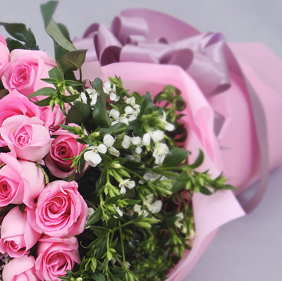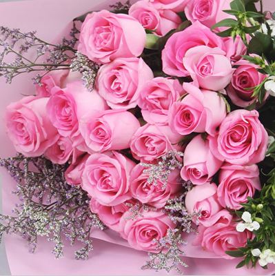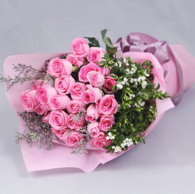 粉色雾面纸扇形包装,浅紫色缎带蝴蝶结。花语:从未奢想荣华富贵,能和爱我的人和我爱的人(你)静静走过生命中所有的春夏秋冬,就是我唯一的、最大的奢侈。附送: