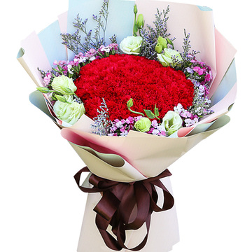 33朵红色康乃馨,3枝绿桔梗,粉色相思梅丰满围边,情人草点缀