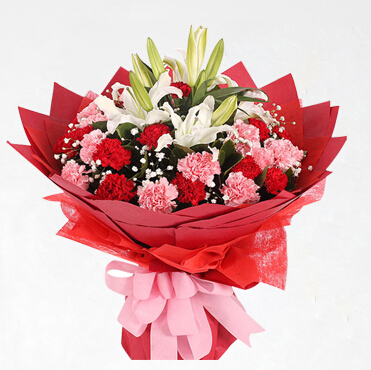 红色、粉色康乃馨共19枝,白百合2枝,绿叶满天星搭配