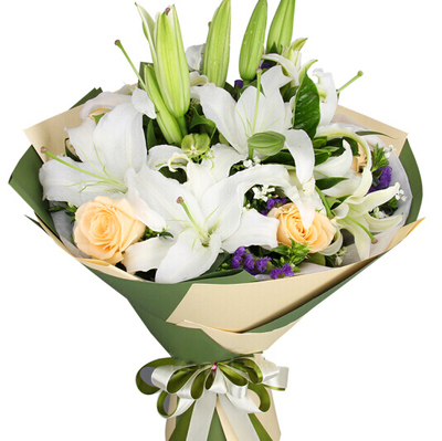 5枝多头白百合,6朵香槟玫瑰,相思梅、黄莺、勿忘我搭配。