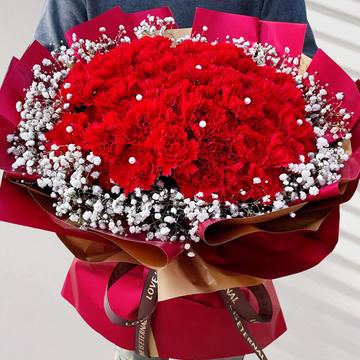 33支红色康乃馨,白色满天星围边装饰,珍珠点缀