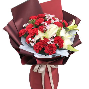 19支红色康乃馨,2枝多头白百合,粉色石竹梅点缀