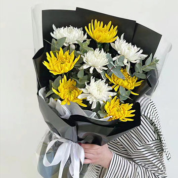 黑色欧雅纸扇形包装,白色缎带束扎花语:春天里的清明,迷茫的雨丝缠绕着怀念的心结附送: