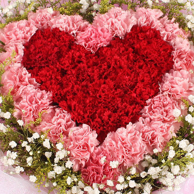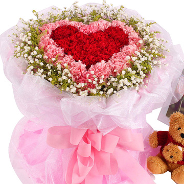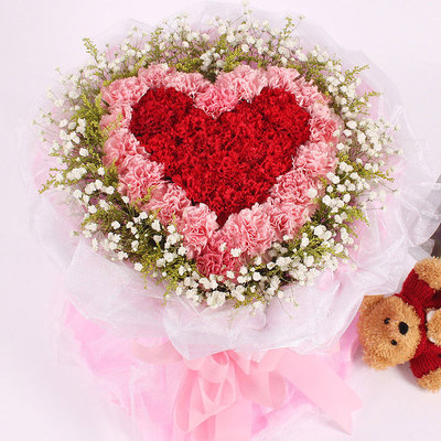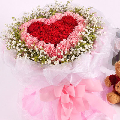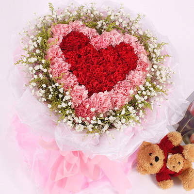 33枝红色康乃馨,33枝粉色康乃馨,黄莺、满天星围绕