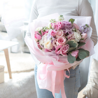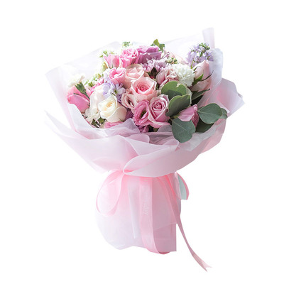 内衬白色绵纸,外层粉色雾面纸多层包装,粉色缎带扎束花语:爱是晴天雨天的相扶相伴;是自得潦倒的彼此牵挽;是快活愁烦的分享分忧;爱是我俩之间不变的密意!附送: