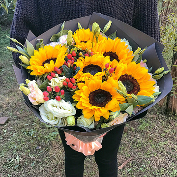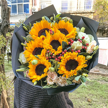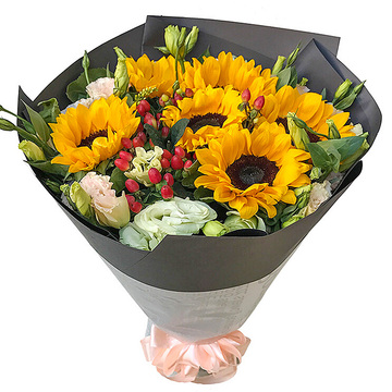 6支向日葵,3支白桔梗2支粉桔梗,火龙珠搭配