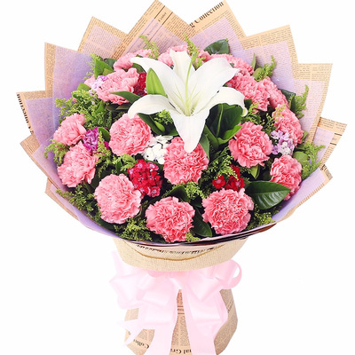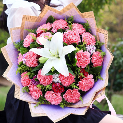 19朵粉色康乃馨,1支香水白百合,搭配适量石竹梅、黄莺、栀子叶。
