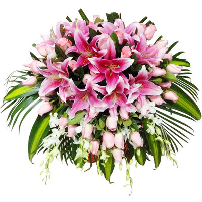 戴安娜玫瑰,粉色百合,白兰,巴西叶,散尾葵。