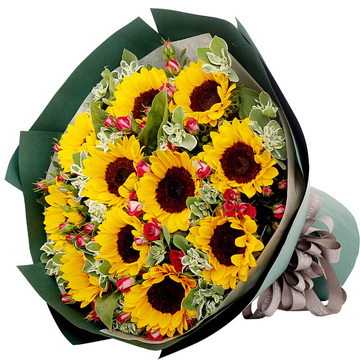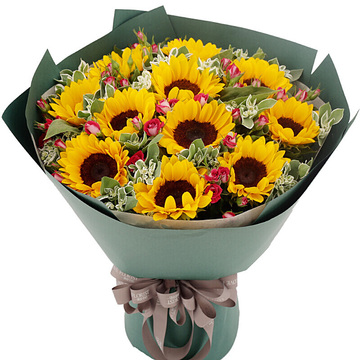 内衬白色素纸,外层深绿色厚牛皮纸圆形包装,咖啡色缎带束扎。花语:我对你的爱如阳光般灿烂。附送: