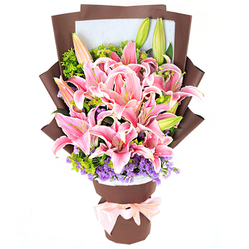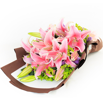 5枝多头粉百合,勿忘我搭配,叶上黄金(或黄莺)丰满间插