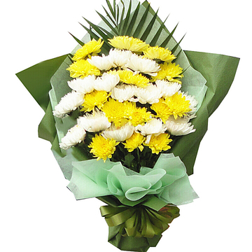 16朵白菊,17朵黄菊,散尾葵、栀子叶