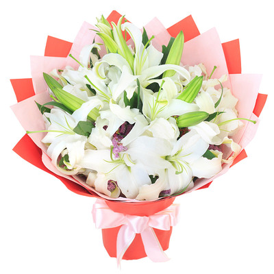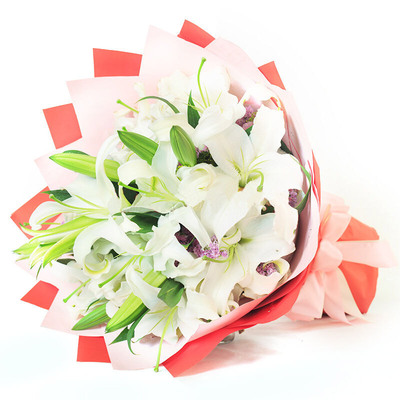 精心挑选15朵香水百合,搭配勿忘我、黄莺、绿叶点缀