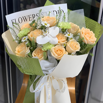 10支香槟玫瑰,1朵白色蝴蝶兰,3支绿色康乃馨(若没有用绿桔梗替换),搭配绿铃草,白色小雏菊丰满间插
