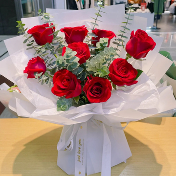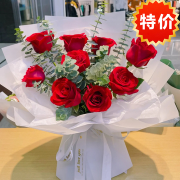 9朵红玫瑰,尤加利间插搭配