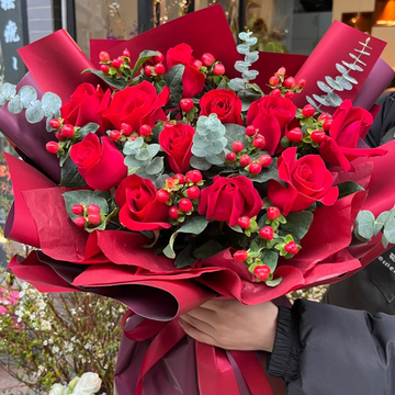 11朵红玫瑰,红豆搭配,尤加利间插