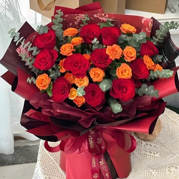 11朵红玫瑰,5支橙色芭比丰满间插,尤加利搭配