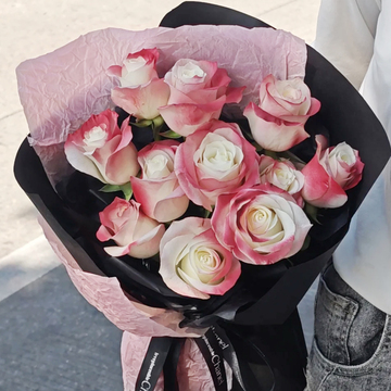 红+粉韩式包装花语:与你在一起,哪怕一句话也不说,你的一个表情,也让我从心里欢喜;与你在一起,轻轻的握着你的手,把心里暖暖的情意,传到你我的心里。附送: