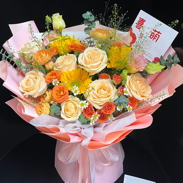 9朵香槟玫瑰,3支向日葵,2支粉桔梗,5支橙芭比,喷泉草尤加利间插