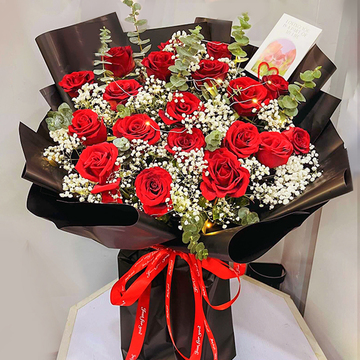 19朵红玫瑰,白色满天星,尤加利,灯带