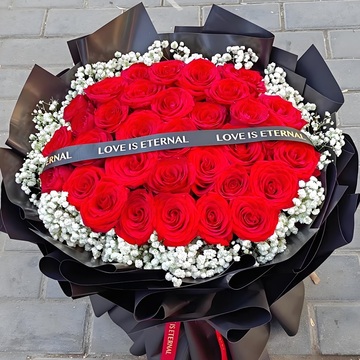 33朵红玫瑰,白色满天星丰满,缎带束扎