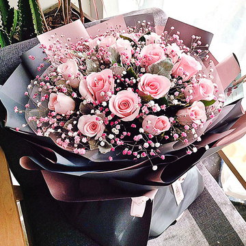 白色雾面纸内衬,灰+粉欧雅纸层次包装花语:花儿说,为了你我不愿随风而去;花儿说,珍藏我们的记忆就是珍藏甜蜜!附送: