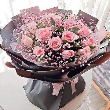 19朵戴安娜粉玫瑰,粉色满天星点缀,银叶菊搭配