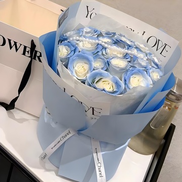 19支精品碎冰蓝玫瑰,珍珠搭配
