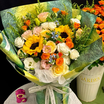 6朵香槟玫瑰,2支向日葵,5支多头白桔梗,3支粉桔梗,5支橙芭比,蓝星花,黄莺或尤加利搭配