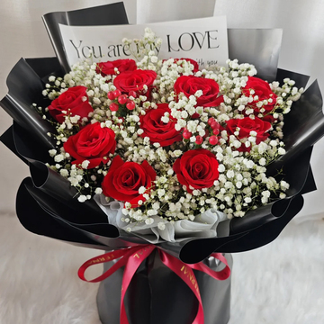 11朵红玫瑰,白色满天星丰满,红豆或红色澳梅搭配