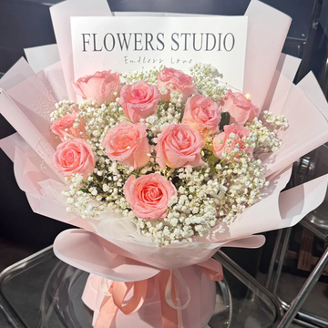 11朵戴安娜玫瑰,白色满天星丰满间插,灯带装饰