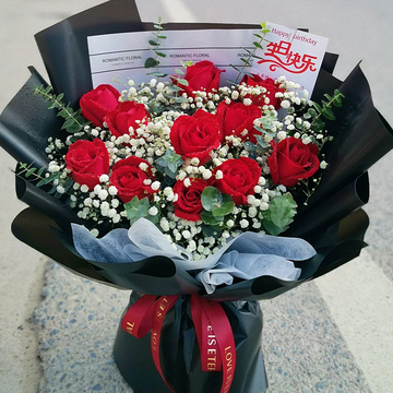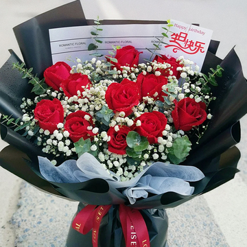 11朵红玫瑰,白色满天星间插,尤加利搭配