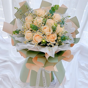 11支香槟玫瑰,洋甘菊和尤加利间插、一条灯带