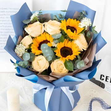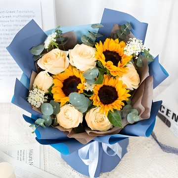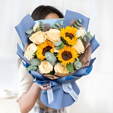 6朵香槟玫瑰,3支向日葵、搭配白翠珠或者白洋甘菊、尤加利叶