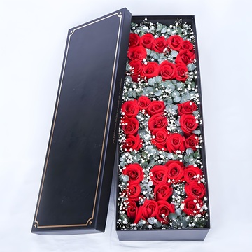 长方形礼盒装(礼盒颜色根据店里安排)花语:我要用沧海桑田不变的爱来打动你的心,用海枯石烂不朽的爱来滋润你的心,用一生一世永恒的爱来呵护你的心。附送: