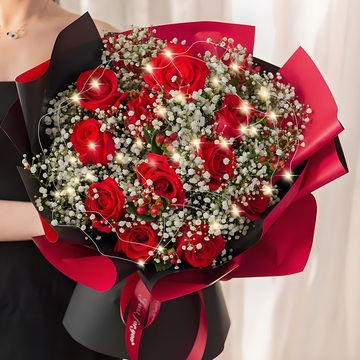 精选11支红玫瑰,白色满天星丰满,红豆搭配,一条灯带