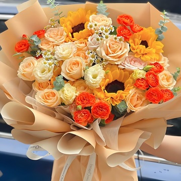 14朵香槟玫瑰,2朵粉雪山,3支向日葵,3支橙色芭比,白桔梗适量,洋甘菊搭配,尤加利间插