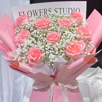 9朵戴安娜粉玫瑰,白色满天星丰满间插