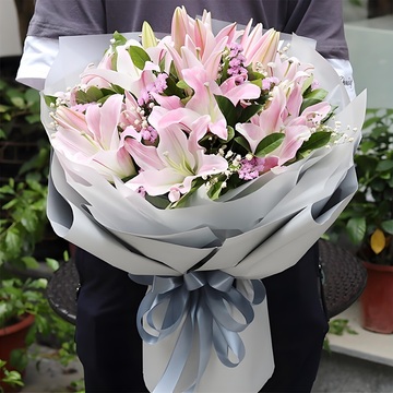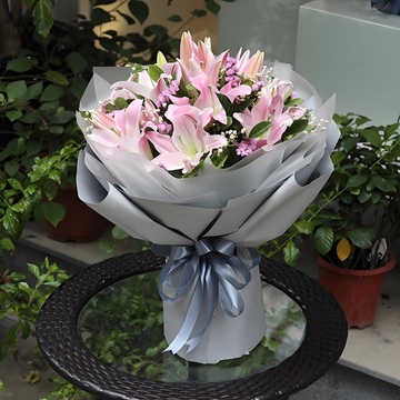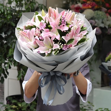 7枝多头粉百合花束,黄莺、石竹梅搭配。