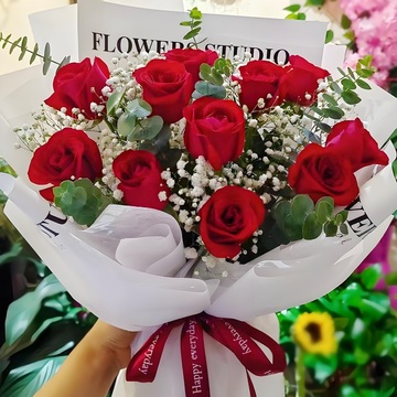 11朵红玫瑰,白色满天星间插,尤加利搭配