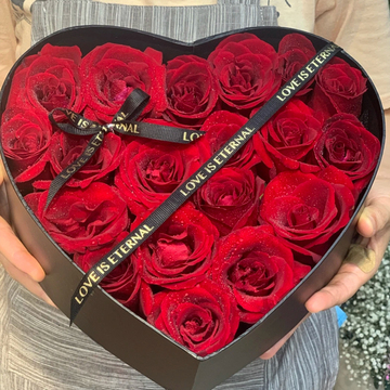19朵红玫瑰心形礼盒,丝带蝴蝶结装饰