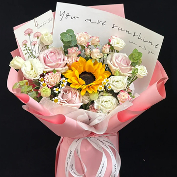 1支向日葵,3朵粉佳人玫瑰或戴安娜,5支多头白桔梗,4支折射泡泡,洋甘菊、尤加利搭配