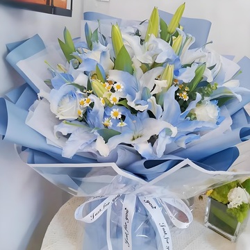 6枝多头碎冰蓝百合,2朵碎冰蓝玫瑰,小雏菊搭配